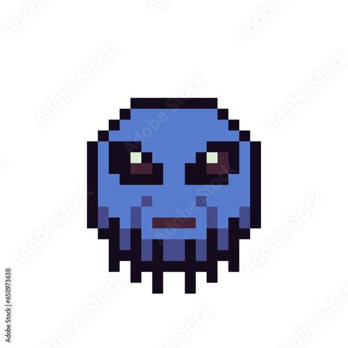 Alien with beard blue face pixel art icon halloween emoticon cartoon character. 8-bit style. Language emotion. Flat style. Isolated abstract vector illustration.