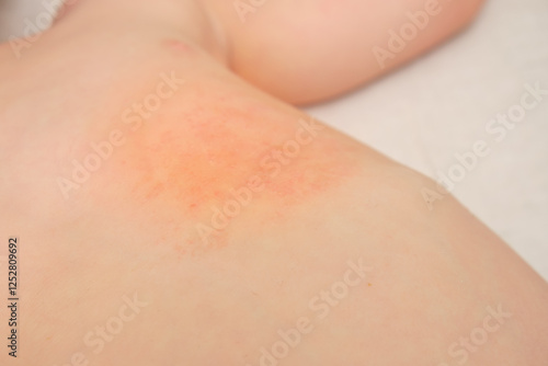 Allergic skin reaction on baby’s chest. Close-up of irritated child skin with redness and rash. Pediatric skincare and allergy concept. A kid aged three years