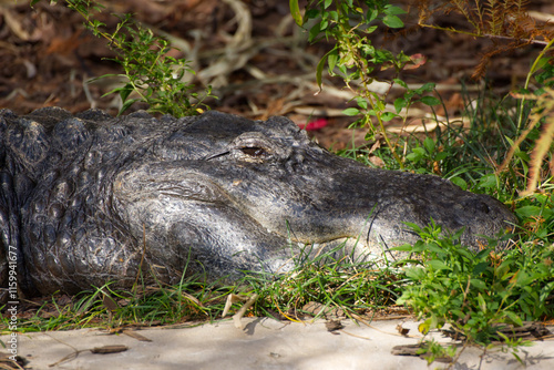 Alligator relaxing on grass and beside trees