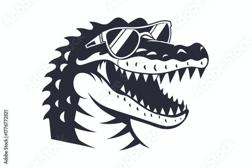 alligator wearing sunglasses is opening its mouth showing sharp teeth in monochrome