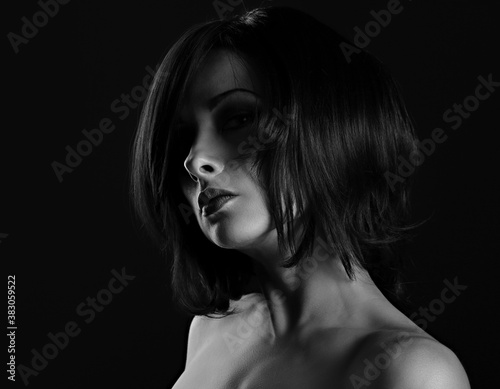 Alluring portrait of short bob hair style woman looking down on black background. Closeup art portrait.