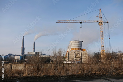 Almaty, Kazakhstan - 02.04.2021 : Cooling tower, Smoking chimneys and tower crane to the district heating