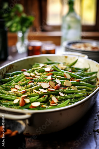 Almond Crunch: Green Beans in Baking Dish Garnished with Slivered Almonds—a Side Dish Idea