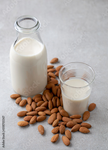 Almond drink milk in glass bottle surrounded by almonds nuts