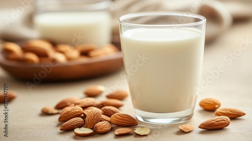 Almond milk preparation, healthy drink, nuts on table, vegetarian option, kitchen setup, natural ingredients