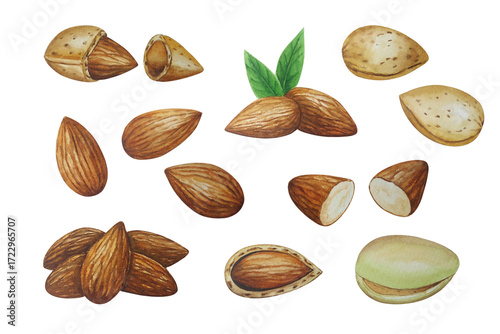Almond nut, watercolor painting. Almond leaves. Almond plant