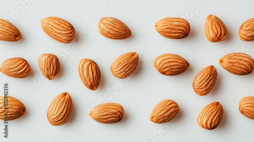 Almonds arranged in a symmetrical pattern on a white background.