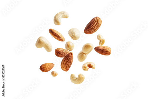 Almonds, cashews, and peanuts floating in mid air on a clean white isolated background