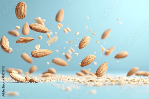Almonds falling on blue background. Perfect for promoting healthy snacks, recipes, and food blogs.
