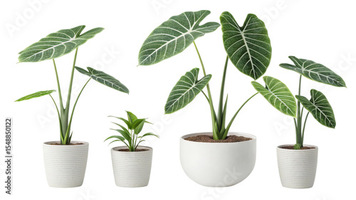 Alocasia plants in white pots isolated on transparent background