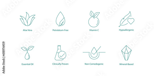 Aloe vera, No petroleum oil, Vitamin C, Hypoallergenic, Essential oil, Clinically proven, Non-comedogenic, Mineral-based icons vector illustration