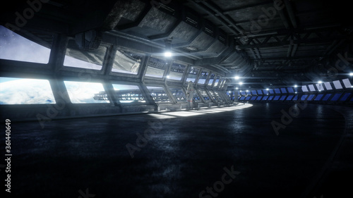 alone astronaut in futuristic space corridor, room. view of the earth. 3d rendering.