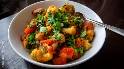 Aloo Gobi Dish with Potatoes and Cauliflower Garnished with Fresh Coriander on a Wooden Table