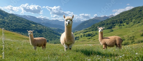 Alpacas grazing in a lush green mountain meadow on a sunny day.