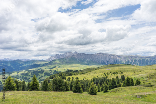 Alpe di Siusi, Seiser Alm with Sassolungo Langkofel Dolomite, a large green field with a mountain in the background