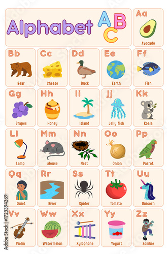 Alphabet for kids to learn alphabet letters with cute illustrations.