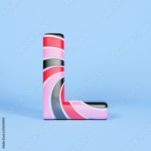 Alphabet letter L uppercase. Christmas font made of pink, red and black striped lollipop. 3D render on blue background.