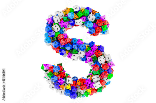 Alphabet letter S, from colored roleplaying dice. 3D rendering