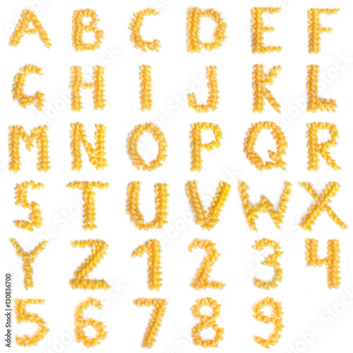 Alphabet made of macaroni letters isolated on white background