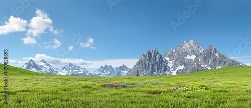 Alpine Meadow With Snowy Mountains Under Sunny Sky