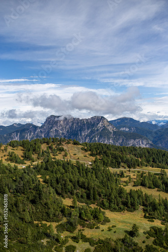 Alpine scenery on a serene day, showcasing the grandeur of nature and the human trace of a path.