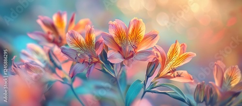 Alstroemeria flowers in close-up with a dreamy color toned background creating a serene and vibrant floral atmosphere.