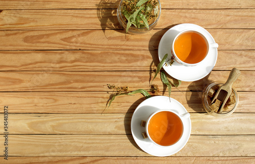 Alternative tea with linden in white cup of tea and cookies with wooden spoons on a brown wooden background. Healthcare tea, alternative medcine
