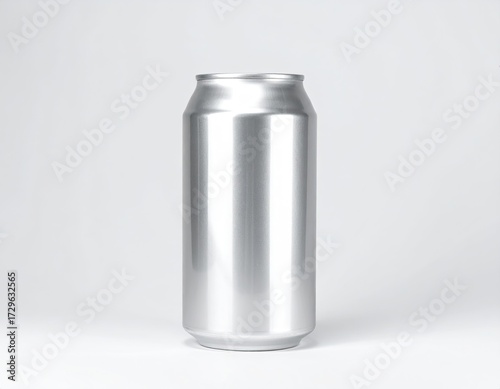 Aluminum can stands tall, light reflecting, plain backdrop