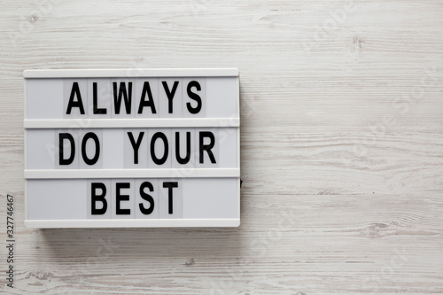 'Always do your best' words on a lightbox on a white wooden background, top view. Overhead, from above, flat lay. Copy space.