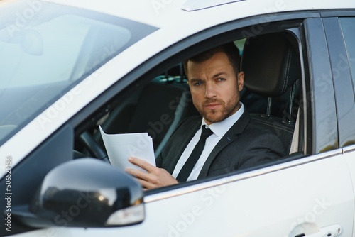 Always in a hurry. Handsome young man in full suit smiling while driving a car.