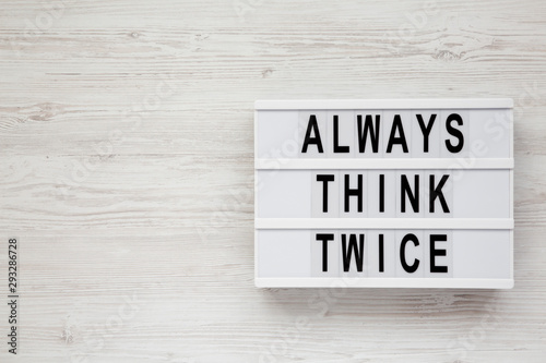 'Always think twice' words on a lightbox on a white wooden background, top view. Overhead, from above, flat lay. Copy space.