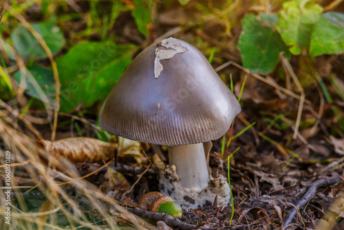 Amanita vaginata. Photo has been taken in the natural forest background.Natural mushroom growing in a forest.Autumn time in the forest.
