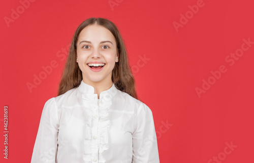 amazed child in white shirt express positive emotions on red background, copy space, amazement
