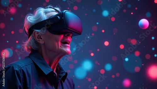 Amazed Elderly Woman in VR Headset with Psychedelic Data Flow. Ideal for showcasing advancements in technology, virtual reality exploration