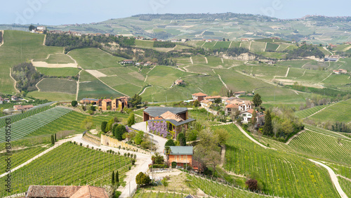 Amazing aerial view of the village of Serralunga d'Alba, one of the Most Beautiful Villages of Italy. Cuneo, Italy