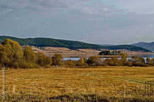 Amazing autumn view of glade, hill, shore, forest with deciduous and coniferous trees around Batak dam reservoir, Rhodope mountains, Bulgaria