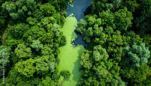 Amazing blooming algae spread vibrantly across a green river surface - creating a surreal, organic pattern that highlights nature’s texture, aquatic life, and environmental beauty in a striking scene