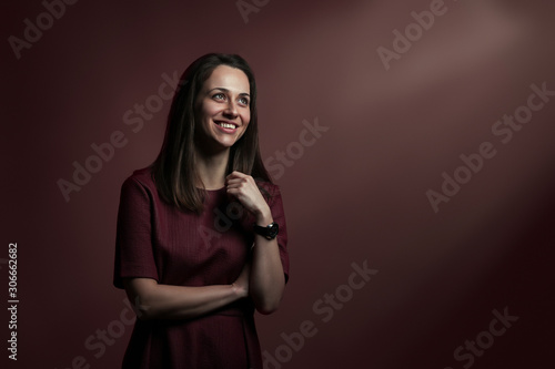 Amazing Grace concept. Portrait of happy woman talking to God over purple background. Copy-space. Studio shot