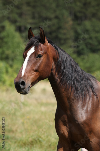 Amazing horse with nice mane on pasturage