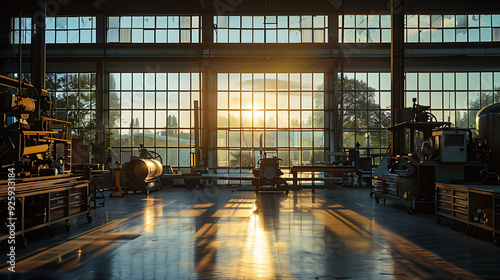 Amazing industrial workshop with machinery silhouetted and beautiful window