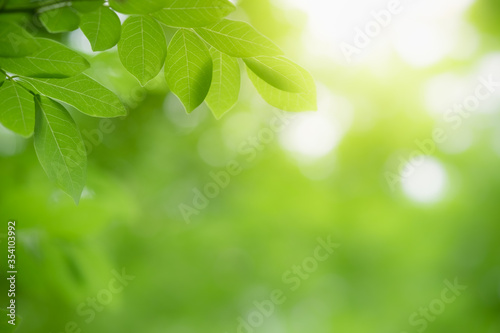 Amazing nature view of green leaf on blurred greenery background in garden and sunlight with copy space using as background natural green plants landscape, ecology, fresh wallpaper concept.