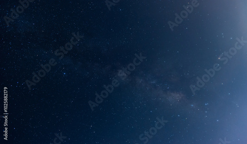 Amazing Panorama blue night sky milky way and star on dark background.Universe filled with stars, nebula and galaxy with noise and grain.Photo by long exposure and select white balance.selection focus
