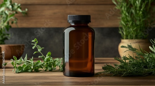 Amber Bottle of Essential Oil with Herbs on Wooden Table
