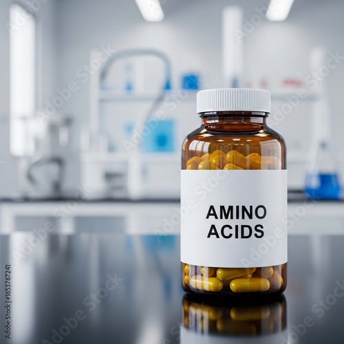 Amber bottle of yellow amino acid capsules in a laboratory setting A white label clearly displays AMINO ACIDS