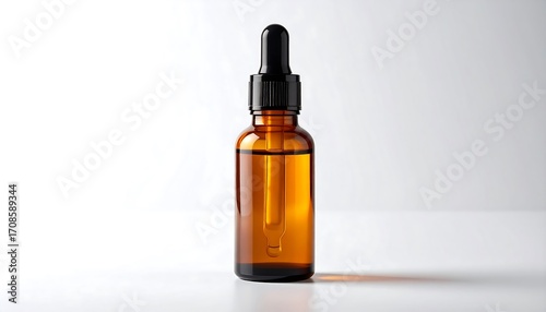 Amber glass bottle with a black dropper on a clean white background in studio lighting