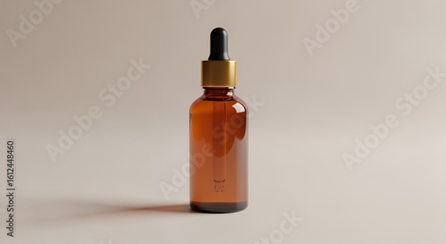 Amber glass dropper bottle filled with a clear liquid sits on a neutral beige background, showcasing its elegant design and minimalist aesthetic.