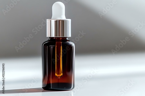 Amber glass dropper bottle with silver cap on white surface in soft natural lighting, casting gentle shadows. Essential oil or serum container for cosmetic products.