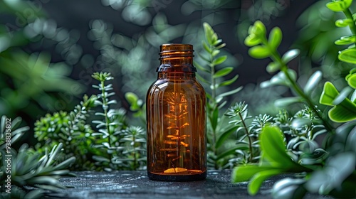 Amber glass medical bottle mockup for pills with green herbal medicine concept.