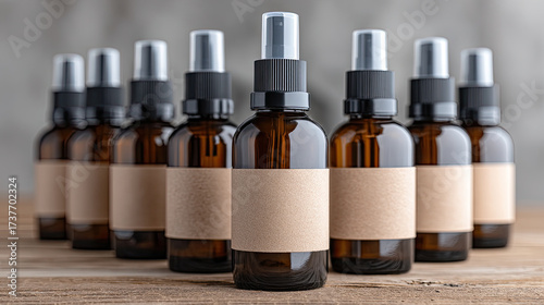 Amber glass spray bottles with blank labels on wooden surface