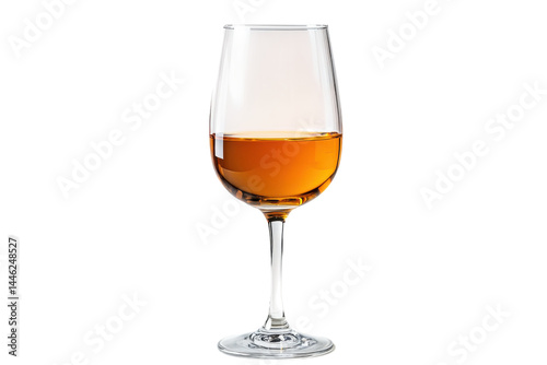Amber liquid fills a crystal wine glass against a bright white background showcasing its elegant